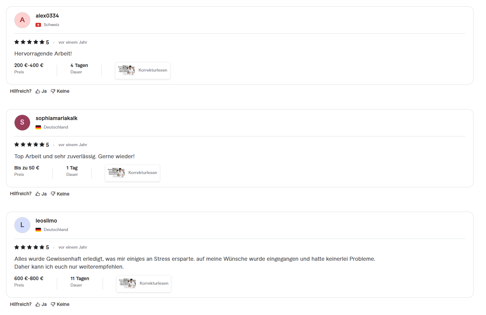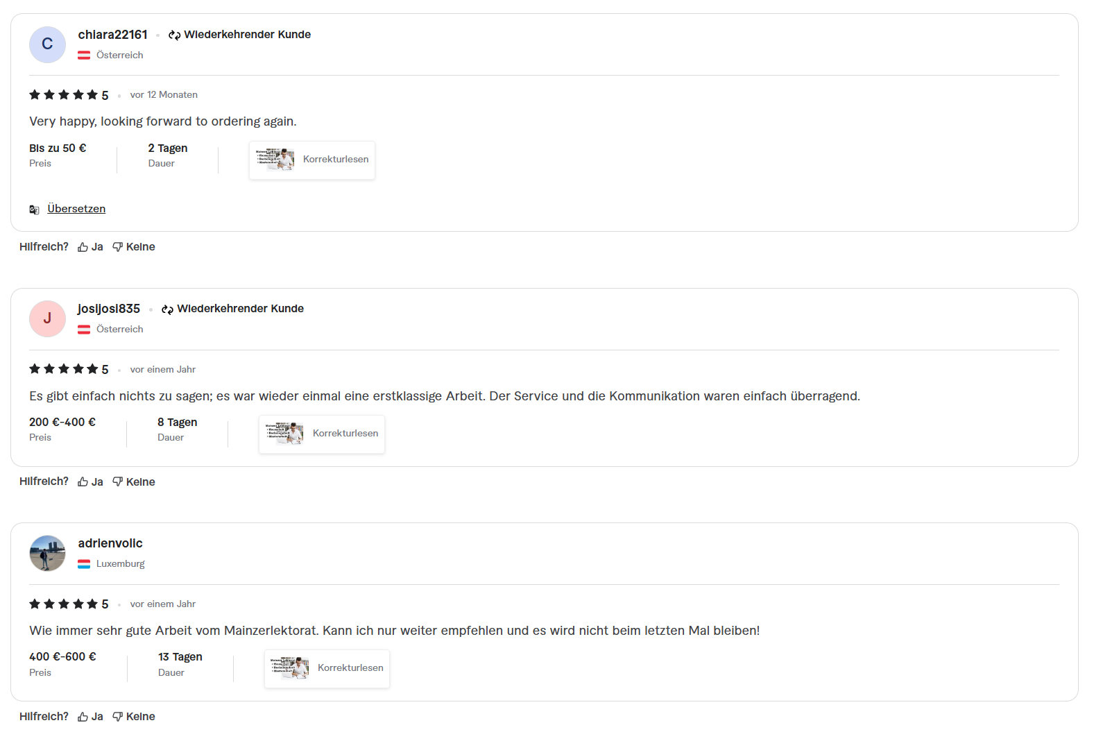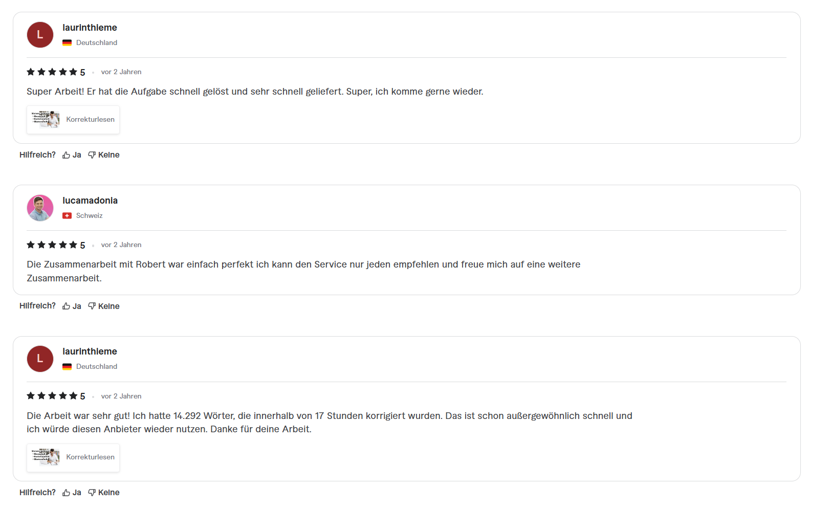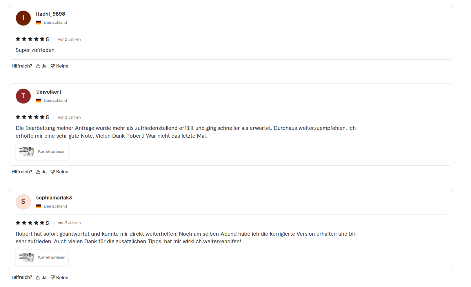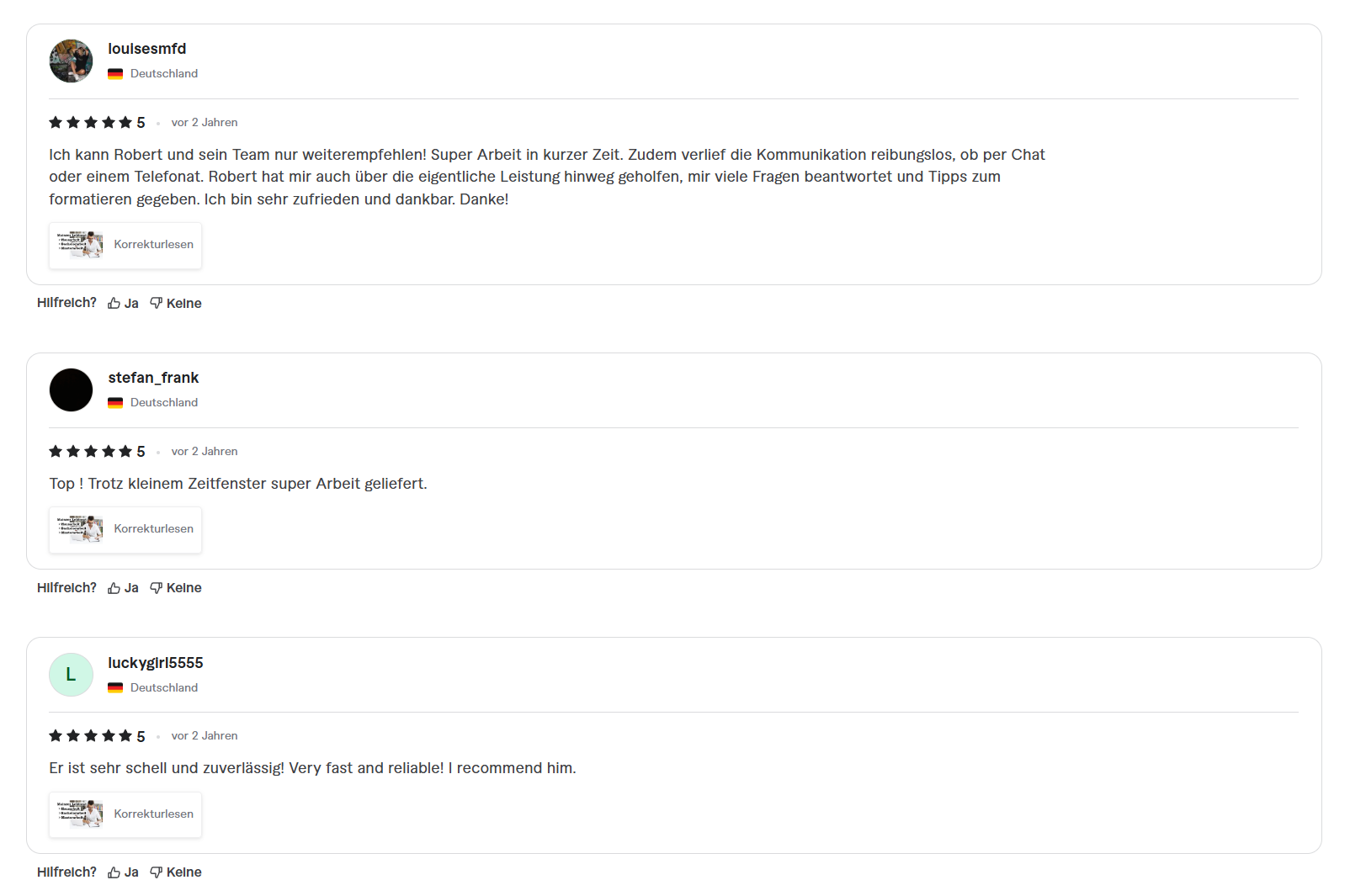 hat den Anspruch, perfekt zu sein. Im Schnitt erreichten die Bachelor-/Master- und Diplomarbeiten, welche von unseren Lektoren überarbeitet wurden, in den Jahren 2021 bis 2024 nach Rückmeldung ein Ergebnis von 1,7 Notenpunkten.